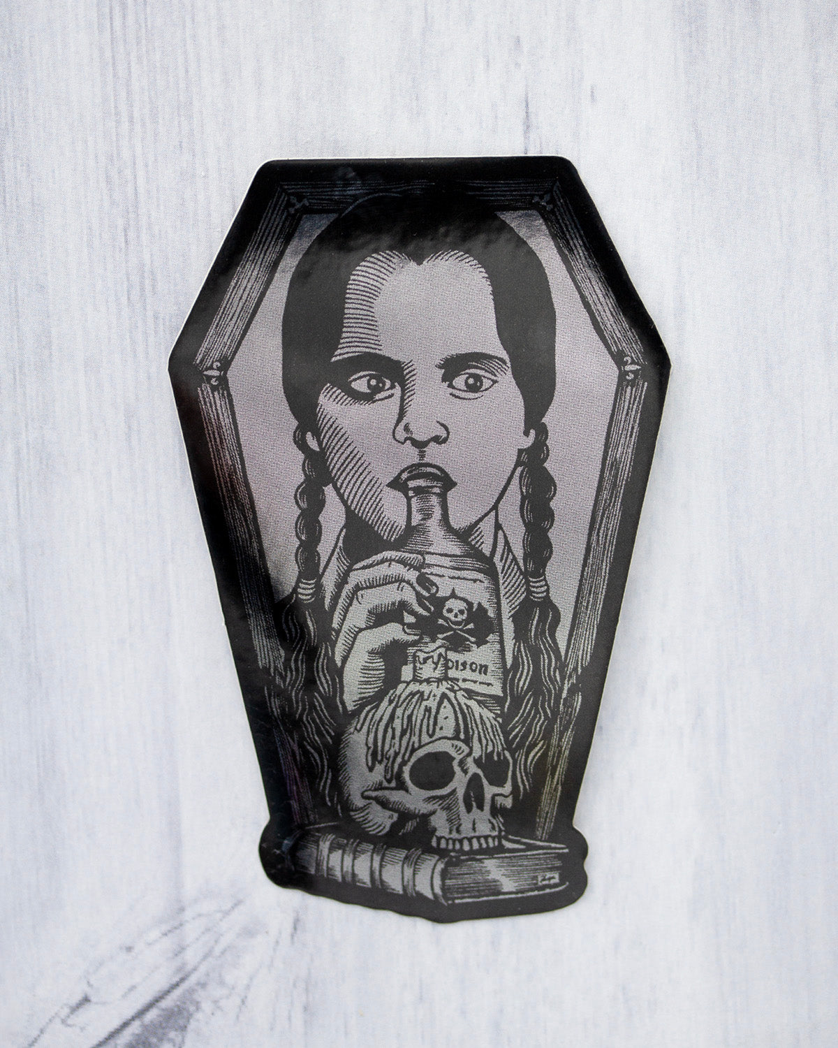 Check out the detail on our new Wednesday sticker, printed on mirror finished vinyl! more Addams Family stickers coming soon!